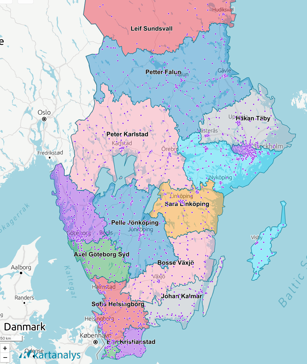 * Webbaserat kartverktyg för planering, optimering av säljdistrikt och regioner i Sverige, Norge, Finland och Danmark.